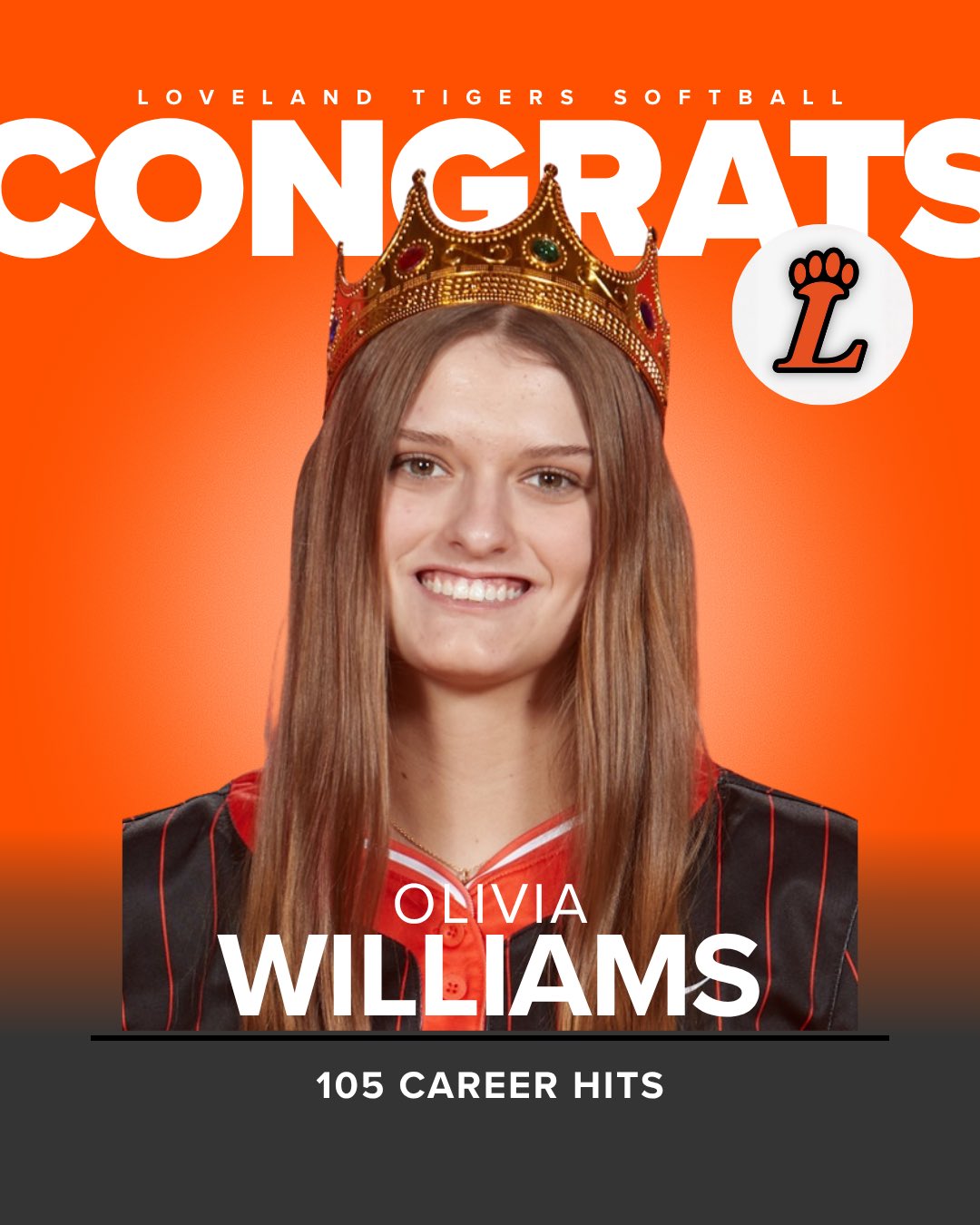 April 19: MILESTONE ALERT: SHOUT OUT to Loveland's Olivia Williams for reaching the 100-hit milestone for the Lady Tigers softball team! She reached the milestone in Wednesday's game against Ursuline!