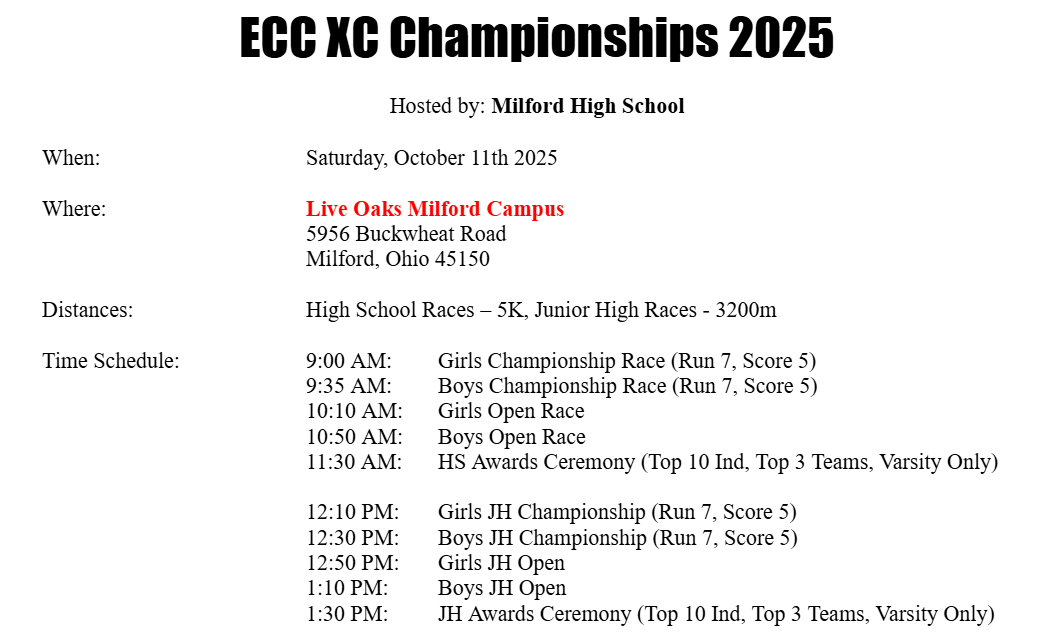 October 7: ECC CROSS COUNTRY CHAMPIONSHIP MEET: Plan now to watch some of the area's top harriers compete in the 2025 Conference Championships on Saturday! Here's the day's schedule: