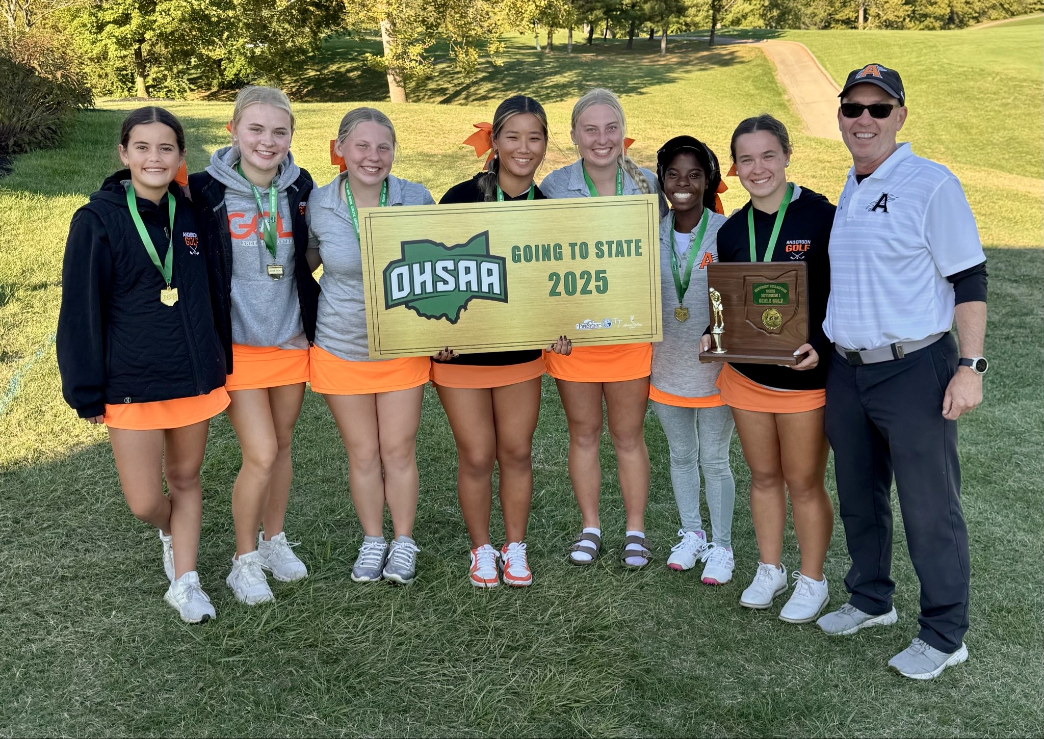 October 8: POSTSEASON GIRLS GOLF UPDATE: The Anderson girls will join the boys at the 2025 STATE TOURNAMENT after winning today's PipeStone District Championship trophy. The Lady Raptors were led by Ellie Lamkin and Aubrey Lunn who shot 78 and 79 respectively. Other team members included Sara Lunn (83), Rachel Lunn (85), and Denise Kenner (102). Little Miami's Lauren Perry and Lebanon's Olivia Donovan also punched their tickets to STATE after their second-place rounds of 76. Individual results are HERE.