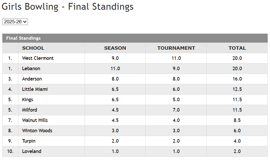 GIRLS BOWLING: The Lebanon Lady Warriors finished ECC play with a perfect record, while West Clemront finished runner-up at 8-1. CONFERENCE TOURNAMENT: West Clermont came away with the ECC Tournament championship. Lebanon and Anderson finished second and third respectively. ECC CHAMPIONS: Based on regular season and tournament results, West Clermont and Lebanon will share the 2025-26 league title. Top three finishers were Lebanon's Caitlyn Kober, Milford's Lilly Foertsch, and Lebanon's Savannah Billiter. Complete individual results are HERE.